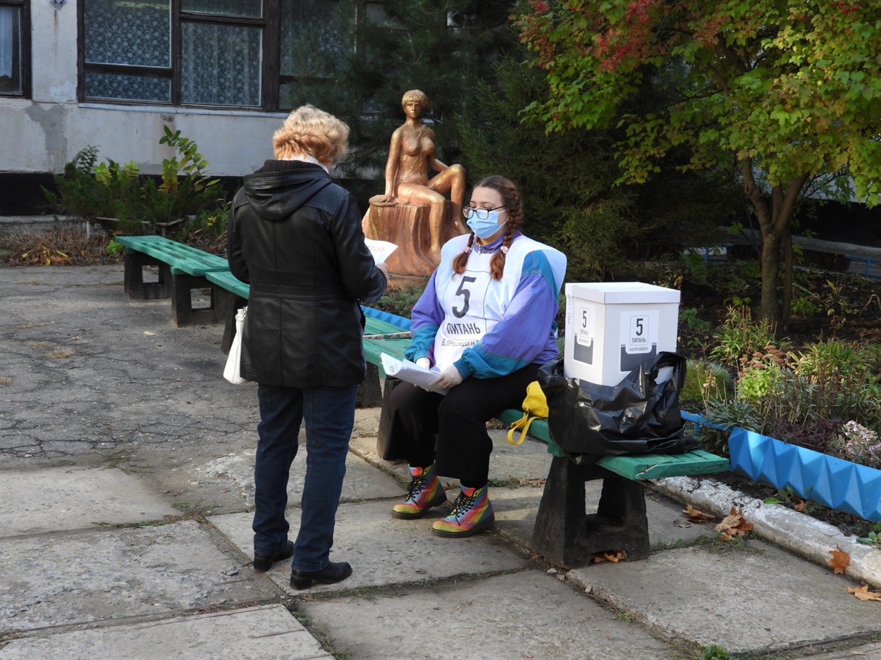 На виході з дільниць на лозівчан чекають обіцяні п'ять запитань від Президента. Як і анонсували, одяг волонтерів та скриньки не мають партійної символіки. Це опитування не обов'язкове, багато лозівчан його ігнорує, говорять дівчата-волонтери. Є й ті, які охоче відповідають.